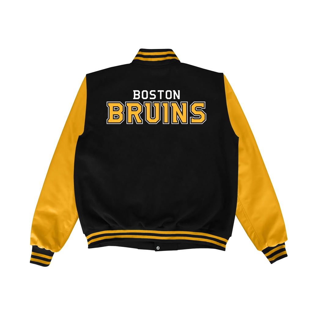The Boston Bruins Letterman Jacket is a classic and fashionable outerwear garment designed for the fan wanting to express their loyalty to the Boston Team in a classic and sporting fashion. Taking inspiration from traditional letterman jackets, the Varsity Jacket features the very best in materials, comfort, and classic design. Made using a quality mix of wool and leather sleeves, this jacket is both durable, warm, and plush. The ribbed collar, cuffs, and hem of this jacket also ensure a fit while still managing to retain the traditional look of a varsity jacket. The snap button on the front of this jacket is also convenient while adding to its immaculate look.