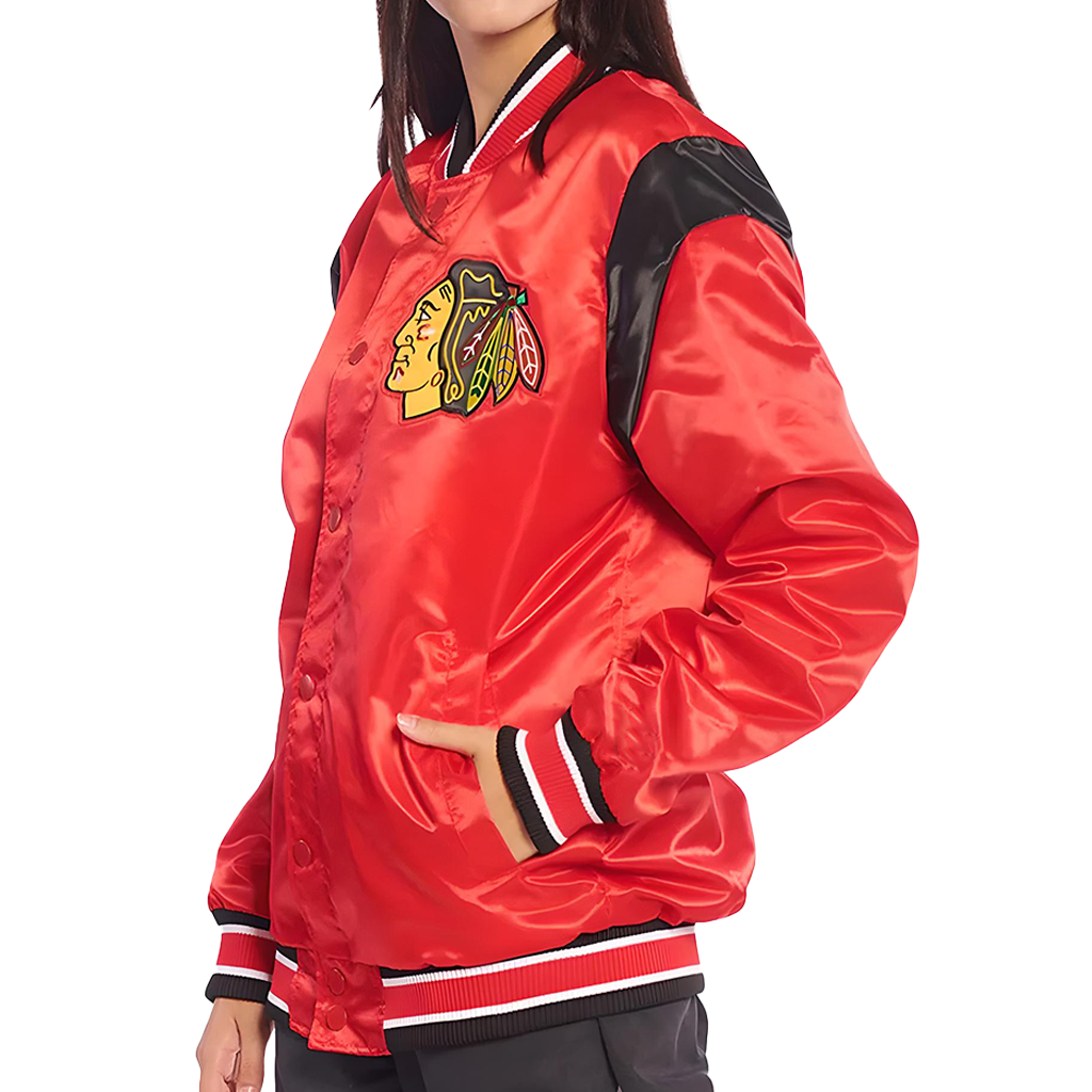 This jacket features the official Chicago Blackhawks logo, which can be displayed on the chest or back. It lets you showcase your support for your favorite team in style. The black base color pairs easily with jeans. The front closure, with a zipper or buttons, blocks wind and keeps you warm. Long sleeves, hem, and cuffs provide full coverage and retain body heat. Side pockets offer storage for essentials like your phone or wallet. Distinctive stitching enhances durability. Whether heading to the game, grabbing coffee, or enjoying cool weather, this jacket adds team spirit and style. Chicago Blackhawks fans will find it essential.