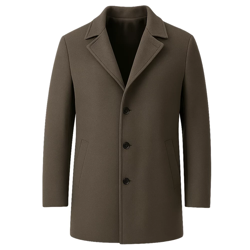 Christmas in Midnight Clear 2025 Coat reveals the quiet grandeur of a winter landscape under a starry sky with a masterly study of masculine elegance and refined texture. Cut from substantial wool, this outerwear makes an impressive statement with its clean, architectural lines and a drape that grants superior warmth and a distinctly sophisticated silhouette. The generous lapel-style collar frames the torso strongly and flatteringly, while full-length sleeves are finished with a modern open hem, which allows for fluid, unrestricted movement and enhances the overall grace of the outfit. A discreet buttoned closure secures the front, maintaining an impeccably polished line from collar to hem. Inside, a smooth viscose lining provides a luxurious feel against other attire, thereby improving comfort and wearability. The earthy brown colorway in rich, deep shades, resonant with aged mahogany, firmly grounds the piece with timeless versatility, turning this Jonathan Ian Brown Coat into a cornerstone of seasonal style. This is a garment defined by its deliberate construction and the harmonious balance between classic tailoring and contemporary detail.