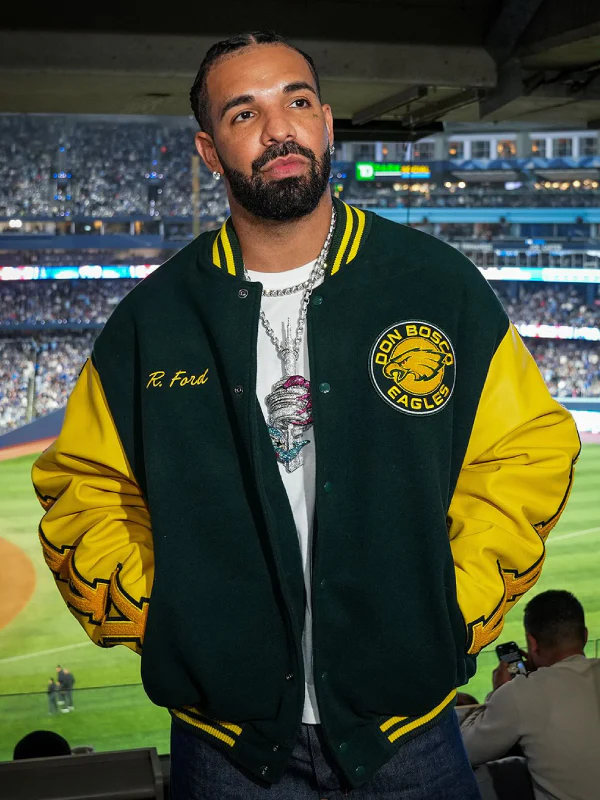 Drake Don Bosco Eagles Varsity Jacket a chic ode to athletic excellence and daring street fashion. Inspired by the effortlessly cool Drake, the jacket blends classic varsity design with modern-day sophistication, making it a must-have for fans of sporty luxury. It is expertly crafted from high-quality wool fabric with genuine or faux leather sleeves, offering durability and comfort. The soft viscose inner lining ensures warmth and a smooth feel against the skin, and the rib-knitted cuffs, collar, and waistband provide a secure, tailored fit that keeps the cold out.