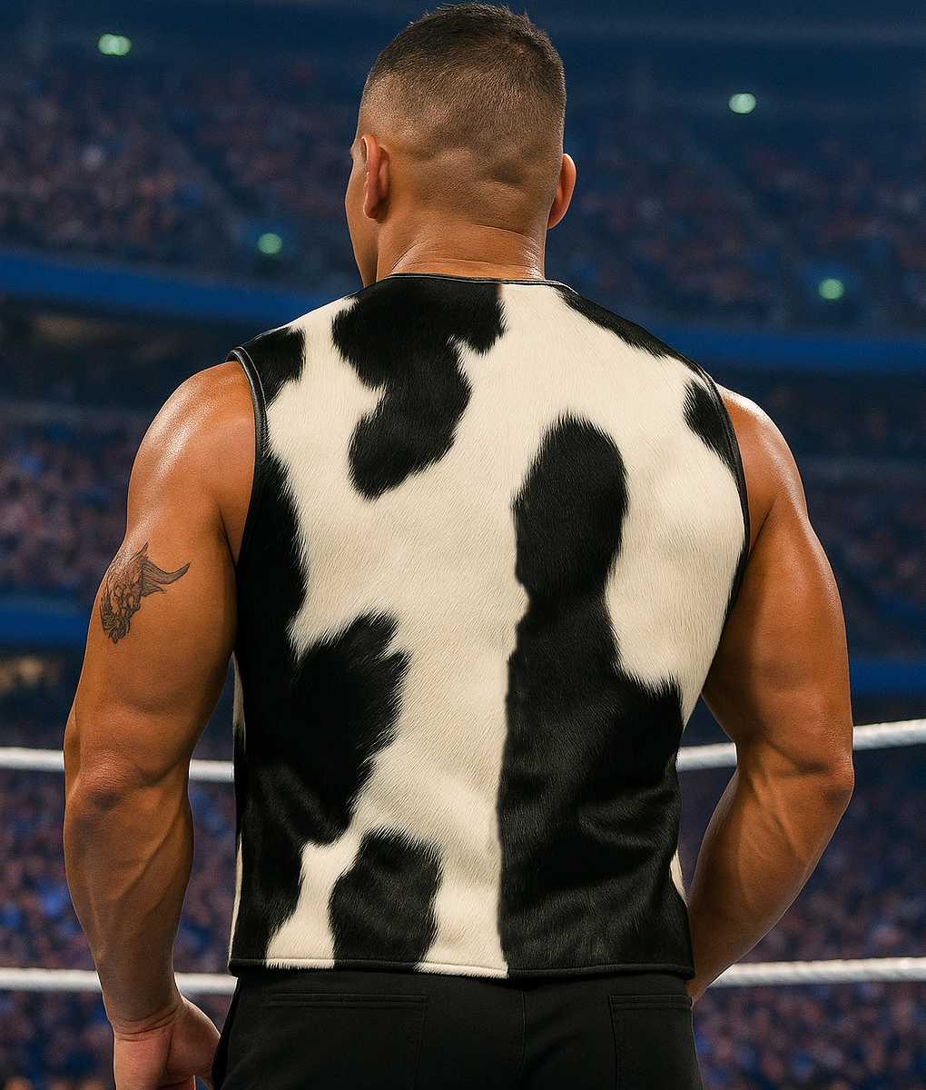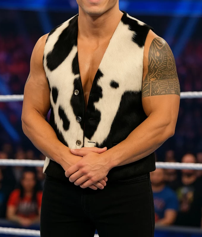 Dwayne Johnson Cow Vest a bold and nostalgic tribute to The Rock’s iconic look from his legendary appearances on Monday Night RAW. This vest captures the essence of Dwayne Johnson’s early days, when charisma, confidence, and unmatched style made him “The Most Electrifying Man in Sports Entertainment.” Made of premium faux cowhide leather in a stylish black and white cow-print design, this vest is a nostalgic ode to The Rock’s infamous fashion trends that broke rules and made a lasting impact on fans across the globe. Its sleeveless, open-fronted cut lends it that old-school 90s wrestling vibe, but also comes in a breathable, lightweight, and easily layer able package over your favorite tees or tanks.