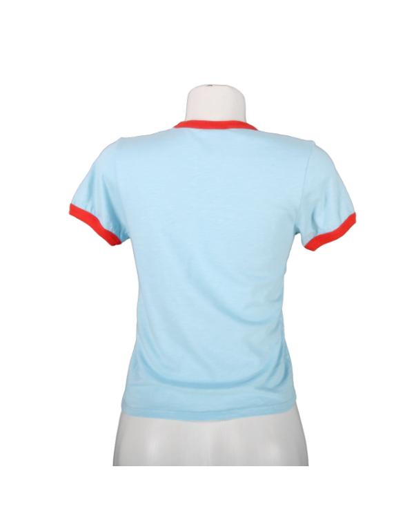 Lovely T-shirt. Nice material and fits well. The blue shade is exactly like in the show.