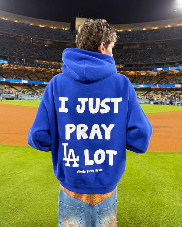 I Just Pray A Lot Dodgers Hoodie is a religiously infused mix of fan enthusiasm and athletic style. It combines Laker-like prayerful energy with the unmistakable Los Angeles Dodgers pride of fashion. LA Dodgers Hoodie is for those who wear their religion and love of baseball together side by side. Made from a luxurious cotton–polyester fleece blend, it provides soft brushed warmth and mid-weight comfort. The material makes it perfect for anything—tailgating, early morning jogs, or quiet afternoons of contemplation. Dropped shoulders and a relaxed fit define its comfortable pullover fit, providing comfort for every body type. The shape is clean, comfortable, and cool.