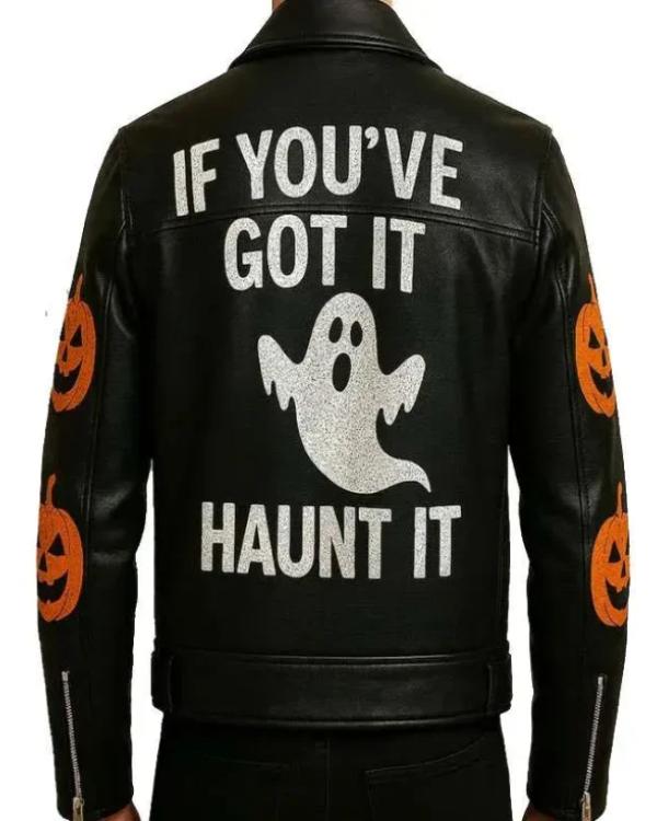 If You’ve Got It Haunt It Ghost Black Leather Jacket is the perfect mix of gothic edge, festive fun, and timeless outerwear style. Designed for those who love to make a bold statement, this jacket blends the sleek appeal of classic black leather with the playful spirit of Halloween. Its standout ghost-inspired graphic details and the witty “If You’ve Got It, Haunt It” theme add a unique personality, making it ideal for spooky season yet versatile enough to wear year-round. Halloween Leather Jacket Crafted from high-quality faux or genuine leather (depending on preference), the black halloween jacket delivers both durability and comfort. The smooth black outside provides a sleek, sophisticated finish, while the plush inner lining keeps it warm and snug on cold nights. Its front zip fastening is practical, and the lapel collar gives it an air of classic biker-jacket cool.