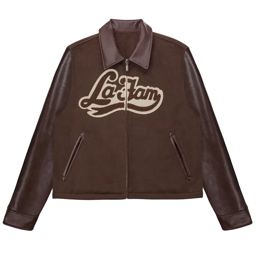 Brown jacket looks even better in person. Love the retro varsity feel.