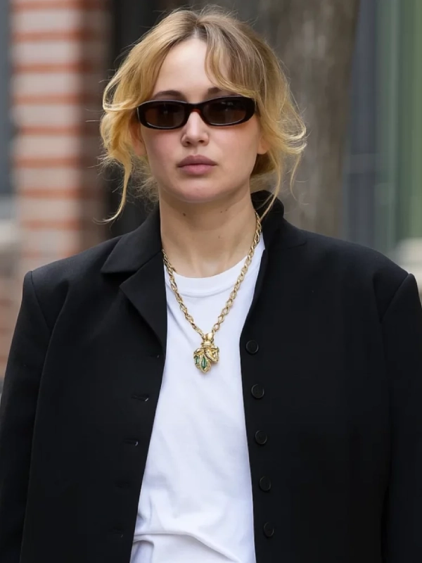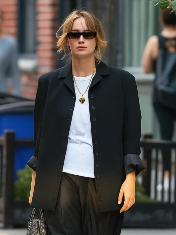 Jennifer Lawrence NYC Black Blazer is an elegant and trendy item that takes cue from Jennifer Lawrence’s effortlessly stylish street wear. Caught in New York City, this blazer is a testament to her signature mix of poise and contemporary chic, hence it’s a must-have for fashion enthusiasts and fans alike. Its classic color black is a timeless choice, providing limitless styling opportunities for work and even everyday use. Expertly crafted from top-quality wool material, the blazer provides durability, light comfort, and smooth finish. The complete inner lining adds wearability and the blazer drapes elegantly while providing comfort for the entire day. The notched lapel collar and single-button front closure add sophistication to any ensemble while maintaining the look polished but restrained.