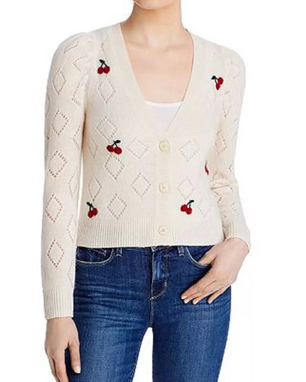 With a slightly cropped or classic hip-length cut (depending on the version), this cardigan pairs effortlessly with high-waisted jeans, skirts, or dresses. It’s the perfect choice for weekend brunch, bookstore strolls, or cozy nights in. The soft pastel or creamy base lets the cherry accents stand out, adding a touch of nostalgia and charm. Whether you’re a fan of the show or simply love delicate knitwear, this piece offers both elegance and comfort. Charming. Feminine. Quietly bold. The Esther McGregor Pointelle Cherry Cardigan tells its story in the softest, most stylish way.