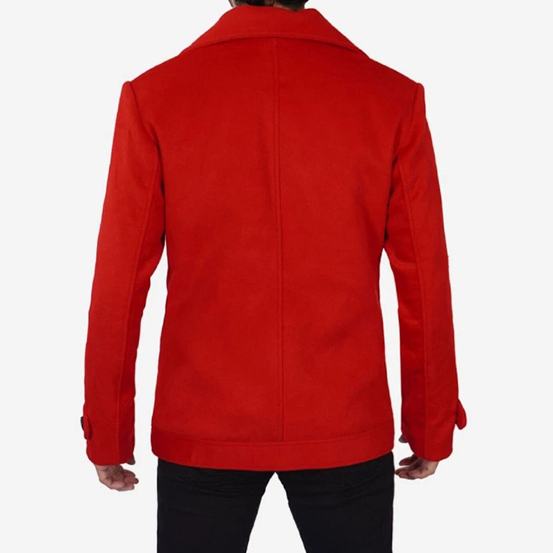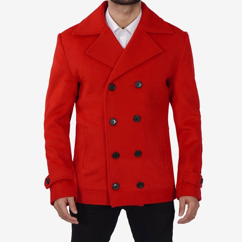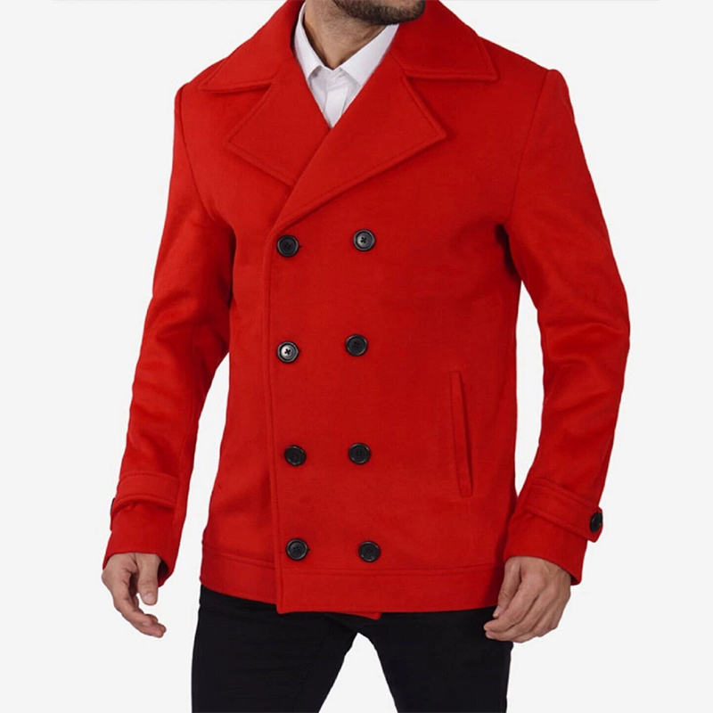 Mens Double Breasted Red Wool Melton Christmas Peacoat
