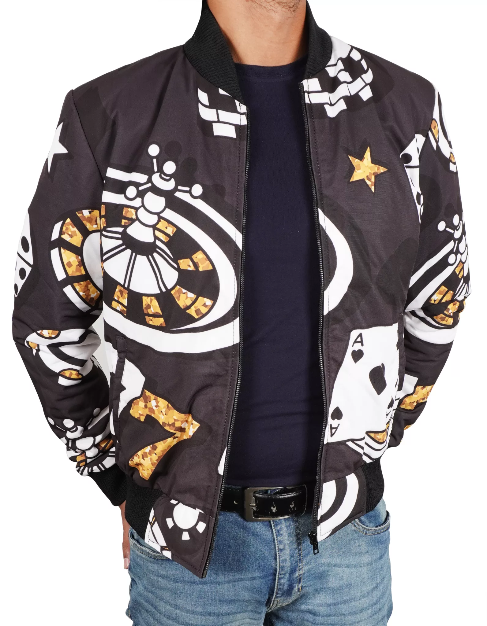 Poker Casino Pattern Jacket—a showstopper that infuses high-stakes vibe into your wardrobe. Drawing inspiration from the glamour and grime of poker rooms, midnight casinos, and vintage Vegas swagger, this jacket is designed for risk-takers, trendsetters, and anyone who knows when to hold ’em. The silhouette typically takes on a varsity or bomber style. Ribbed collar, cuffs, and waistband ensure a snug, athletic fit. A zip-up or snap-button front makes for easy wear. Two side pockets and a soft inner lining add comfort and practicality.