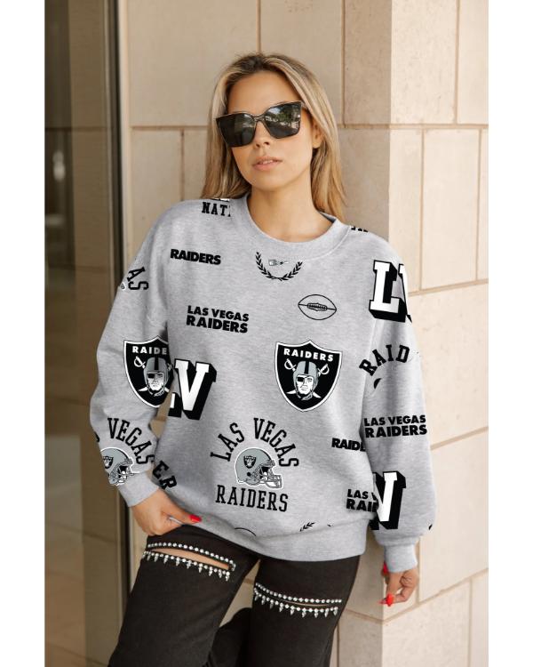 The Raiders Gameday Couture Always On Repeat Grey Sweatshirt is a great mix of sporty comfort and game-day spirit for die-hard Silver and Black fans. Crafted by Gameday Couture, a fashion company renowned for its cool and trendy fanwear, this sweatshirt provides a stylish manner in which to express your Raiders spirit on and off the field. With its timeless grey color and stylish design, it’s a versatile piece that works seamlessly whether you’re heading to Allegiant Stadium, cheering from home, or running errands around town. Crafted from a premium cotton-blend fabric, the sweatshirt delivers softness, durability, and all-day comfort. Its cozy fleece interior provides warmth for cooler days, while the relaxed fit makes it easy to layer with jeans, joggers, or leggings. The ribbed crew collar, cuffs, and hem provide a tight but stretchy fit, maintaining the classic and comfortable silhouette.