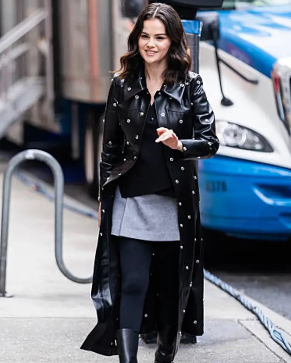 Selena Gomez NYC 2025 Black Leather Trench Coat