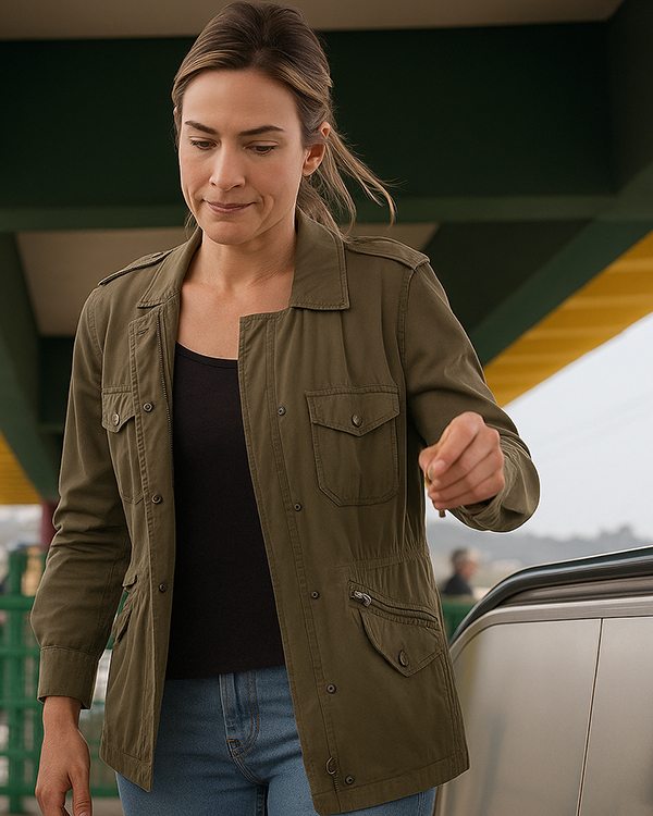 Lily James Cotton Jacket comes in a neutral grey color, allowing it to be a useful layering garment that complements jeans, dresses, or tailored slacks. The long sleeves with button cuffs give a clean touch, while the functional side pockets offer you convenience without sacrificing style. Its fitted silhouette gives you a flattering shape, perfect for both casual and semi-formal purposes. Swiped 2025 Green Jacket is not only a piece of outerwear—it’s a declaration of effortless poise and wearable style. Channel Lily James’s movie-star elegance or seek a trusty jacket to match any ensemble, this one is a must-have to add to your wardrobe. Comfortable, stylish, and versatile, it is the ultimate juxtaposition of function and fashion.