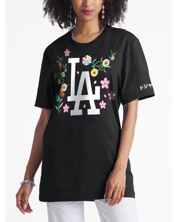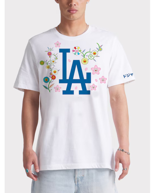 What sets this shirt apart is its striking design—Murakami’s signature colorful flower motifs and whimsical visual language bring a fresh, artistic vibe to the classic Dodgers logo. It’s not just apparel; it’s a statement piece. The front proudly features a playful reinterpretation of the LA Dodgers emblem, making it perfect for fans who appreciate both sports and modern art.