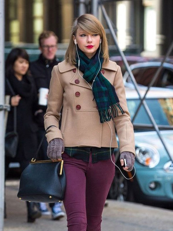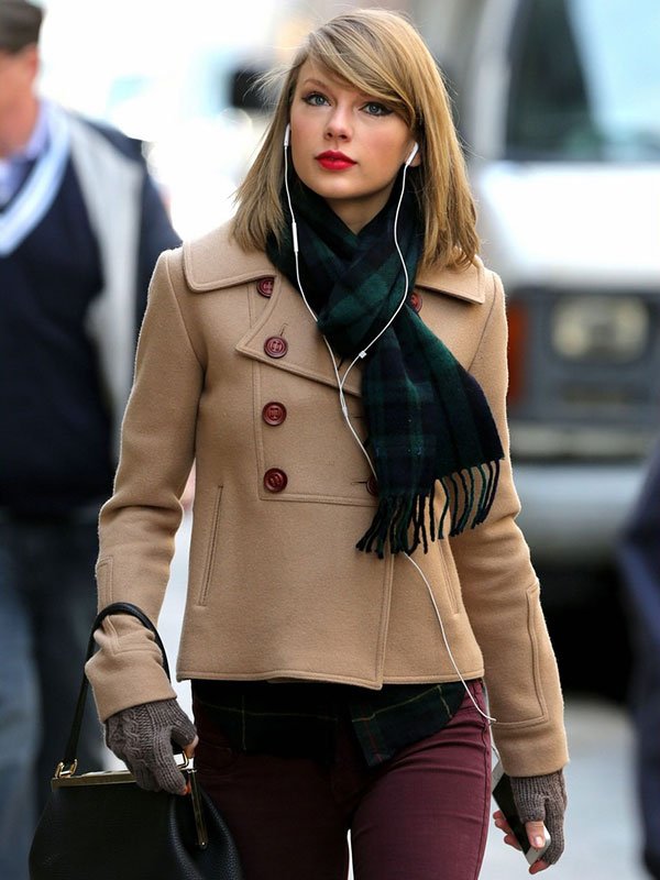 Taylor Swift New York Street Beige Peacoat, a piece that takes inspiration from the international icon’s effortlessly stylish street style. Caught strutting their stuff on the streets of New York, this peacoat embodies the glamour of contemporary sophistication and ageless tailoring. Crafted from high-quality wool-blend material, the coat is incredibly warm without ever sacrificing style, and as such is the ideal outer layer for city days that are cold. The double-breasted front with shiny buttons betrays classic peacoat styling, but the streamlined silhouette is flattering on all figures, providing a streamlined yet snug fit. Its notched lapel collar and knee-length hem provide a level of sophistication, perfect for layering over day wear or evening outfits.