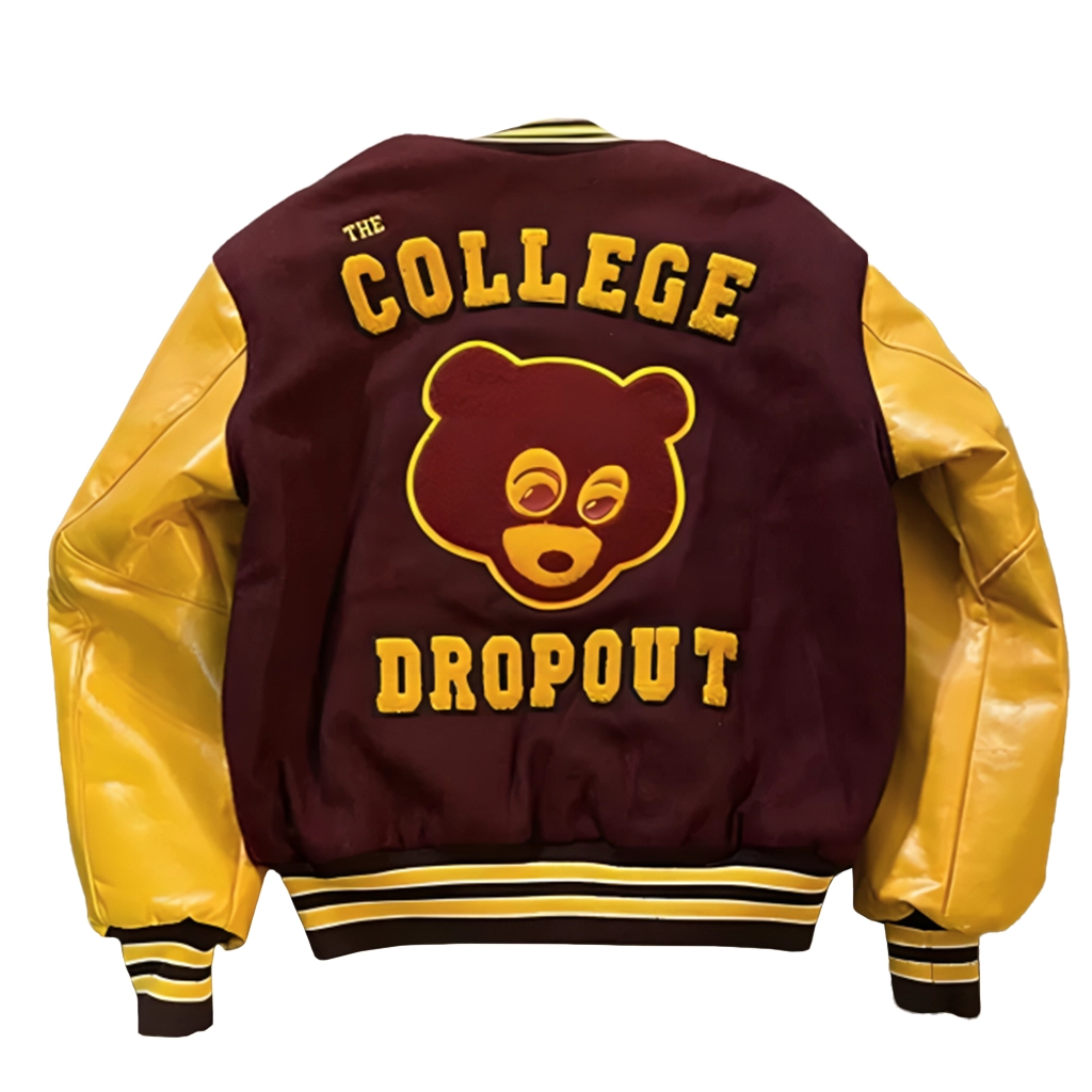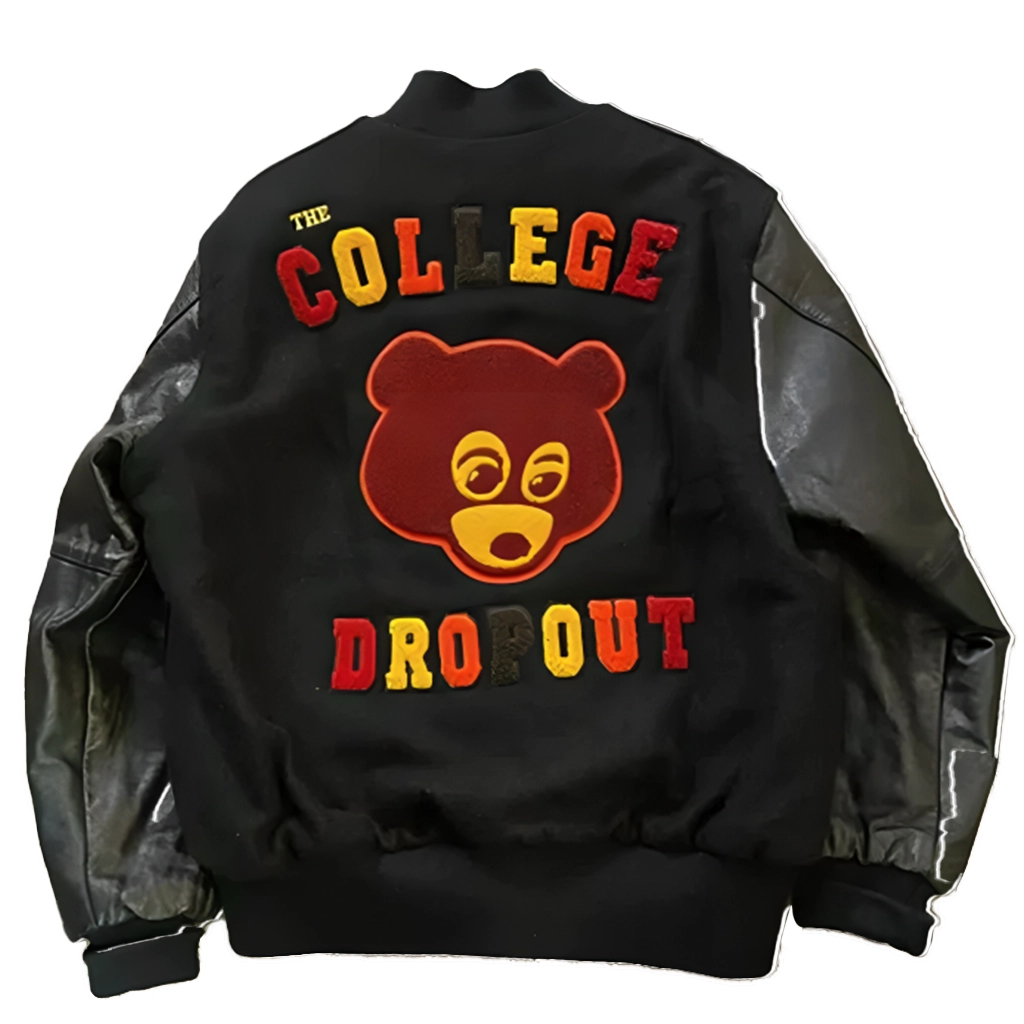 The College Dropout Jacket, a classic piece inspired by Kanye West’s groundbreaking debut album. Famous for its cultural significance and fearless fashion sense, this jacket embodies the spirit of creativity, self-expression, and street-savvy style that The College Dropout period embodied. Crafted from high-quality woolen fabric with authentic leather sleeves, the jacket provides the ideal blend of warmth, longevity, and luxury. The inside is lined with gentle viscose to provide comfort whether the jacket is layered for outdoor wear or worn as a statement garment indoors. The rib-knitted collar, cuffs, and hem ensure a comfortable fit while contributing a classic varsity look to the overall silhouette. The graphic punch comes in the form of bold embroidered lettering and patches honoring the College Dropout aesthetic, including details taken from the beloved bear mascot that became a part of Kanye’s early aesthetic.